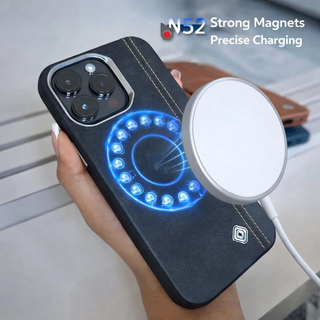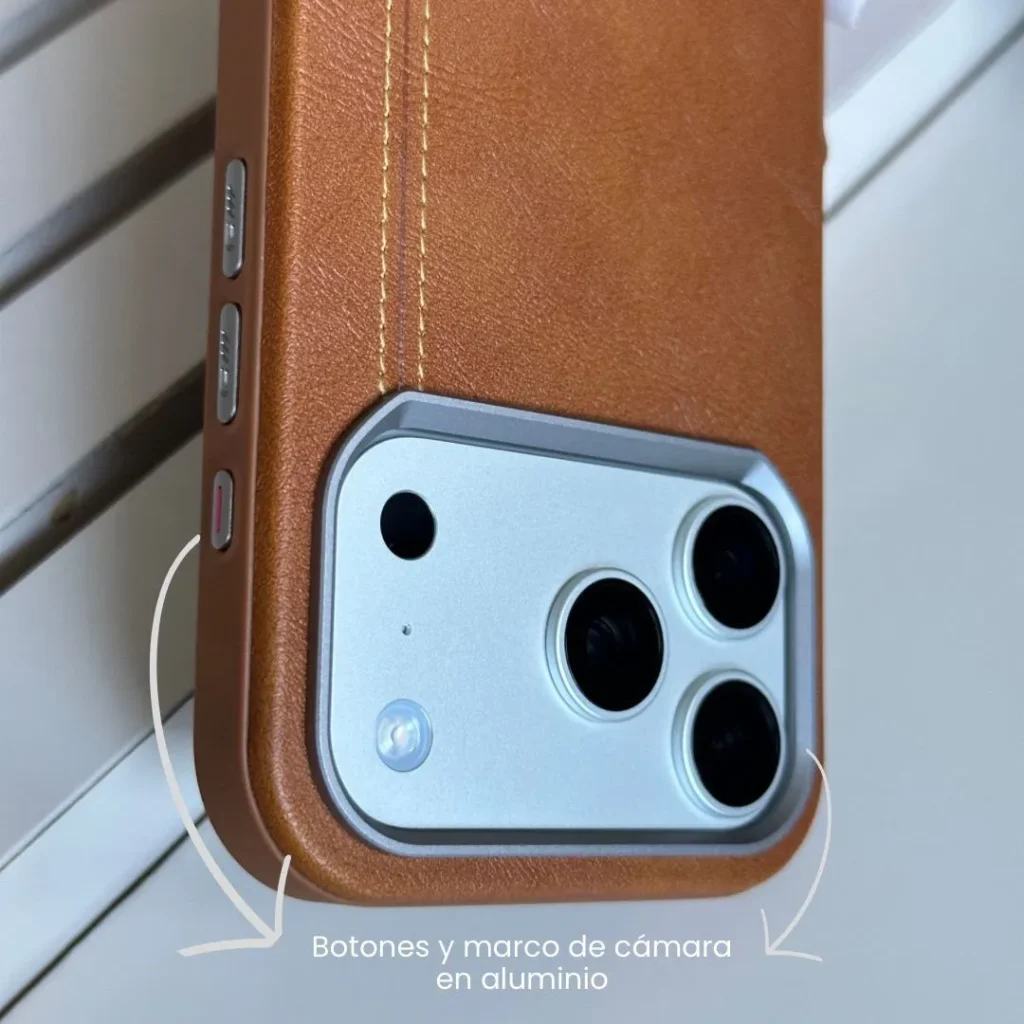 Case de Cuero Premium con MagSafe N52 para iPhone. Elegancia real, protección superior y un agarre impecable. Fabricado en cuero genuino, con bordes en silicona suave, interior en gamuza y marco de cámara y botones en aluminio.